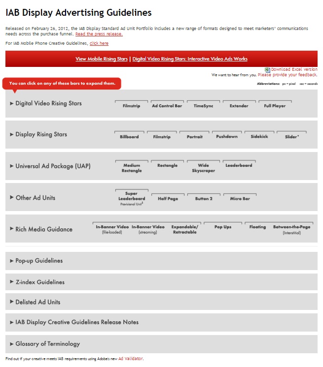 What started out as eight standards in 1996 has grown to include over 33 different creative standards across multiple platforms. It is estimated that over 80% of display ads currently sold follow IAB standards. Today, if you click on the Display Advertising Guidelines under the Guidelines & Best Practices tab on IAB’s website, you will see something like this.
