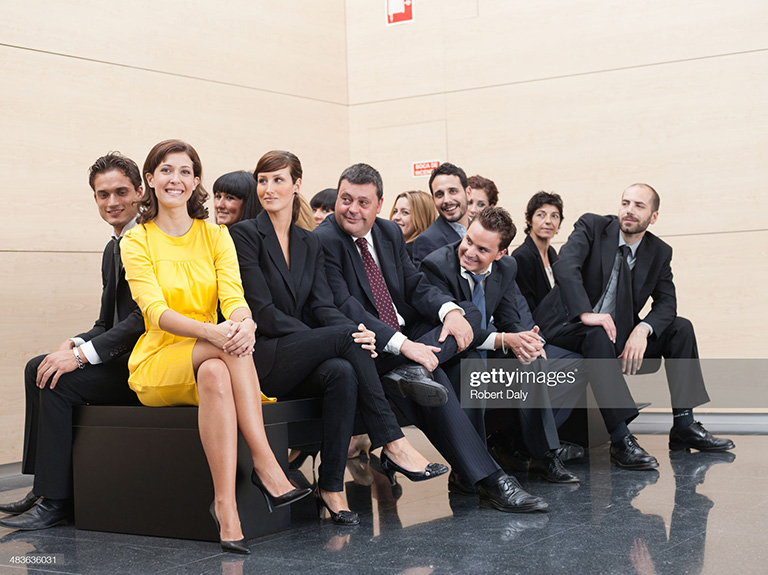 This photo is meant to portray a person who stands out from the crowd and draws attention towards themselves, but that is not what we get. The way the models in suits are fixated on the woman in yellow is unsettling and weird. The most comical part of this photo is the 4th man in the first row; every other model is looking at the woman in yellow but the 4th guy is smiling directly at the camera. Also, all those people crammed on that bench cannot be comfortable. There are plenty of other ways to convey the concept of standing out without using this photo.