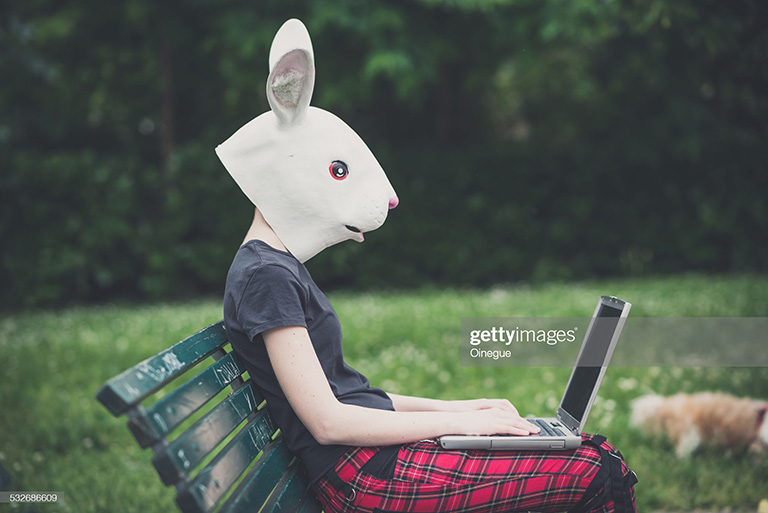 The funniest thing about this image is that it’s part of a perfectly normal series of photos. The rest of the series could be utilized in so many ways, and then there’s the bunny mask picture. There is nothing that really explains the decision to throw a bunny mask on this model and have her sit in a park.