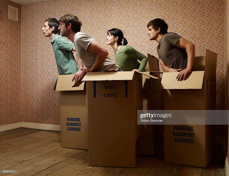 I mean, technically this is directly related to the concept of moving, it’s just depicted in a goofy way. I can’t understand what the goal is with this photo. Where are the models trying to go? Why are they huddled into a single corner of what looks like a small room? The super exaggerated forward leans are what makes this photo so funny, like they’re trying to propel the boxes forward using their noses.